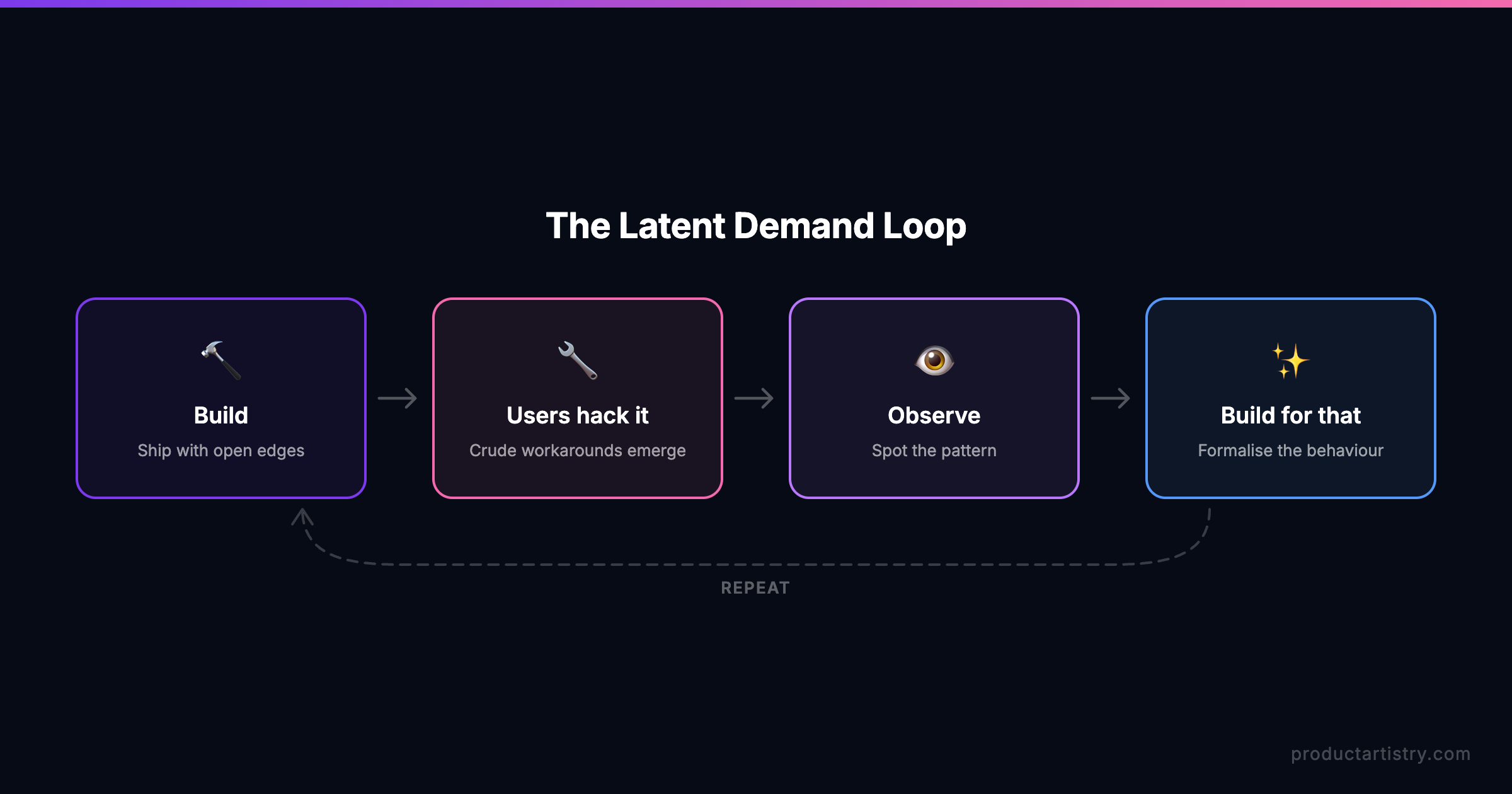The answer is structural, not intellectual. Every PM has heard the advice to “observe your users.” The problem is that most teams treat observation as a phase — something you do during discovery or shaping and then move on. Latent demand doesn't work on a schedule. It emerges continuously, in the gap between what you built and what users actually do with it after launch. And the signals live in places that most product teams never look.