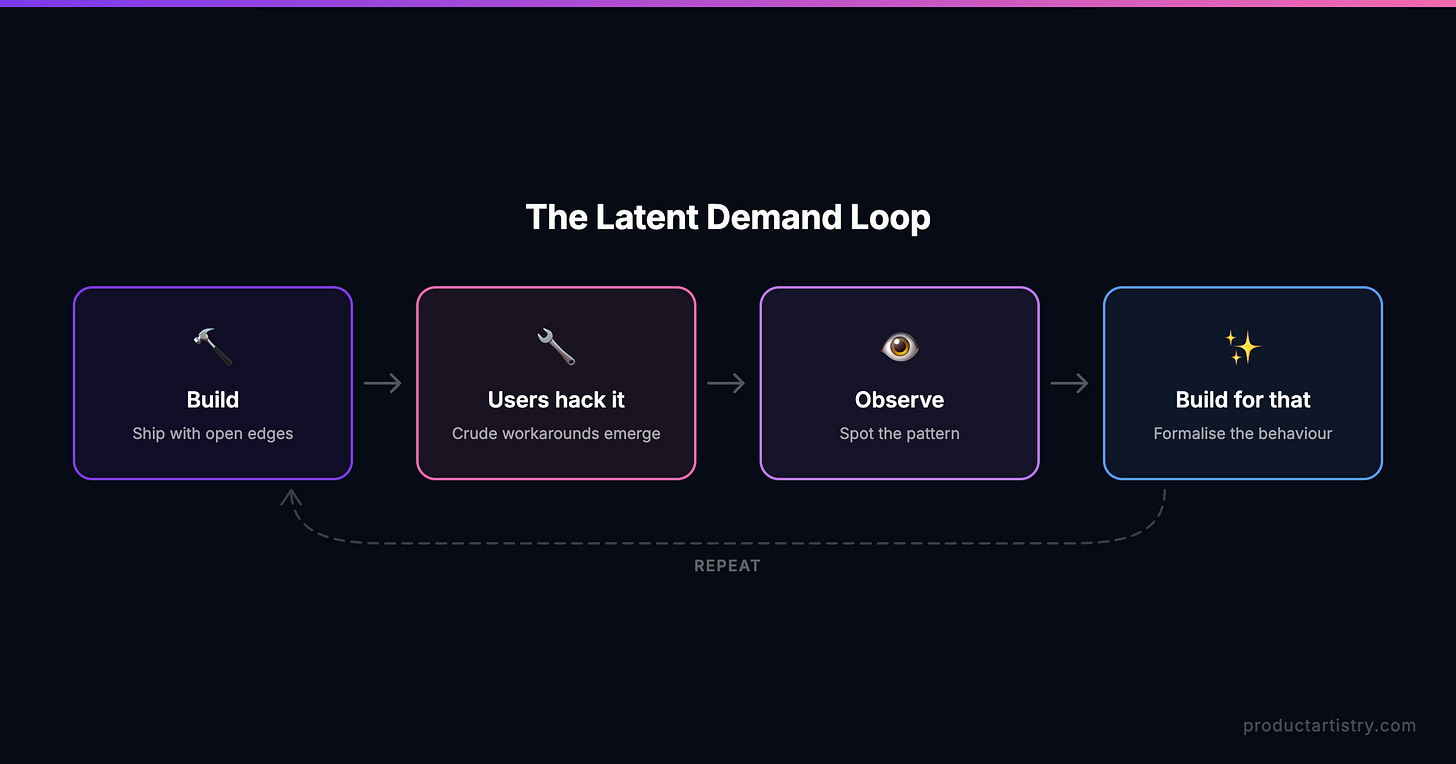 Cherny’s definition is precise — latent demand means identifying what users are already trying to do, often by repurposing existing tools in ways nobody intended, and building a product that makes that existing behaviour frictionless.