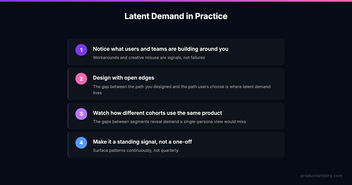 Think about where latent demand hides in practice. It’s in the support ticket where a customer describes an elaborate workaround they’ve built on top of your product. It’s in the operations team’s internal tools, the ones they hacked together because the product doesn’t quite do what they need. It’s in the “creative misuse” that a power user demonstrates on a call, the thing that makes you say “wait, you’re using it for that?”